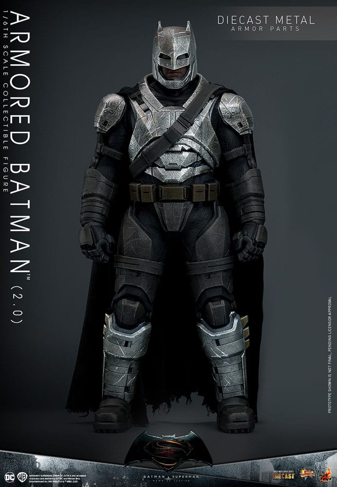 Figurine articulée Armored Batman à l’échelle 1/6 inspirée du film Batman v Superman : L’Aube de la Justice. Modèle fabriqué par Hot Toys et distribué en édition limitée par Sideshow Collectibles.