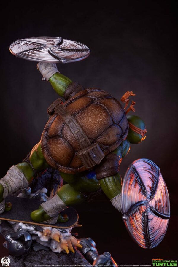 Statuette Michelangelo (Les Tortues Ninja) en résine à l’échelle 1/3, dimensions env. 67 x 47 x 41 cm sur socle décor. Modèle fini et peint à la main avec certificat d’authenticité, en édition limitée par Premium Collectibles Studio.