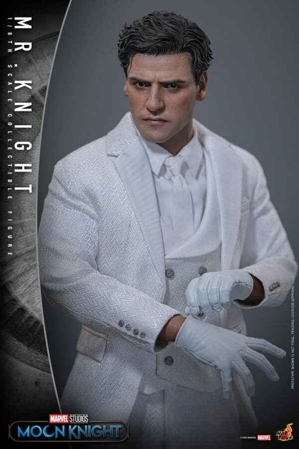 Figurine articulée Mr. Knight à l’échelle 1/6ème. Modèle avec accessoires, livré en emballage boîte-fenêtre de collection. #moonknight